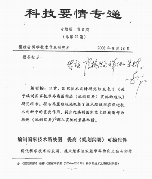 9月2日,李川副省長對省科技信息研究所創(chuàng)辦的《科技要情專遞》專題版第8期刊出的《編制國家技術(shù)路線圖,提高<規(guī)劃綱要>可操作性》一文作出重要批示:“很重要,請?zhí)峁└敿?xì)的資料”。接到批示件后,省科技信息研究所立即組織人員落實(shí)李川副省長的批示精神,著手相關(guān)資料的收集與深入分析。