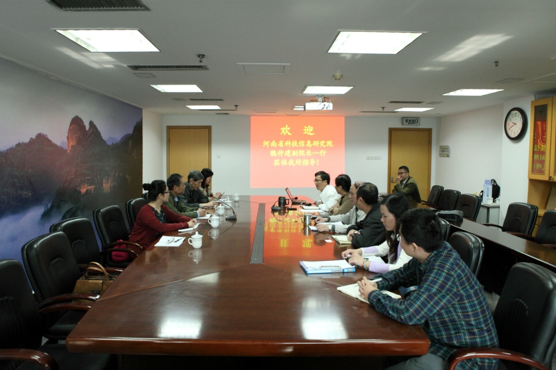 11月18日上午,河南省科學(xué)技術(shù)信息研究院副院長魏仲建一行5人蒞臨我所調(diào)研交流。所黨總支書記高一真、副所長李金算及科技發(fā)展情報室、產(chǎn)業(yè)發(fā)展情報室、業(yè)務(wù)科、綜合辦等部門負責(zé)人與河南院人員進行了座談。