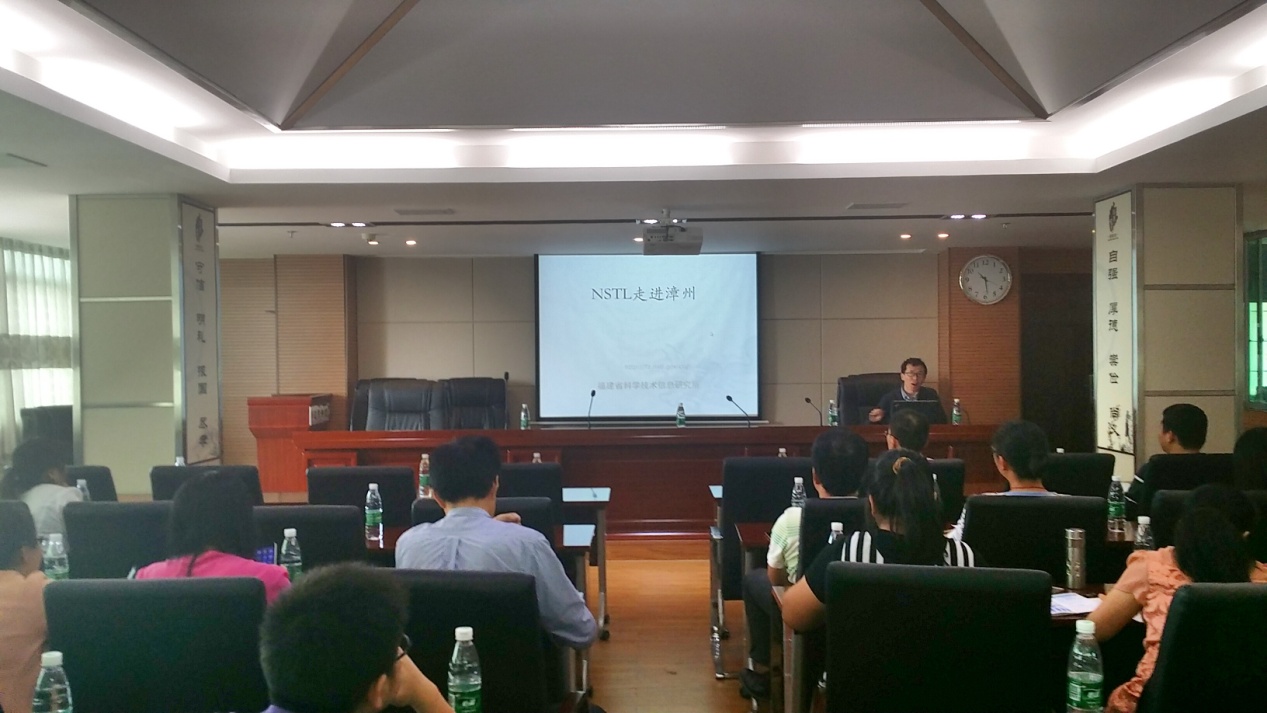 4月28日,文獻(xiàn)資源室與漳州市科技情報研究所共同舉辦 “NSTL及省所科技文獻(xiàn)資源應(yīng)用推廣”講座,李金算副所長與文獻(xiàn)資源室相關(guān)業(yè)務(wù)人員一行4人前往漳州,漳州各縣(市、區(qū))科技局和情報所人員及有關(guān)科研機構(gòu)和企業(yè)人員共40余人參加培訓(xùn)。漳州市科技局副局長蔡亞河主持講座,李金算副所長致辭。