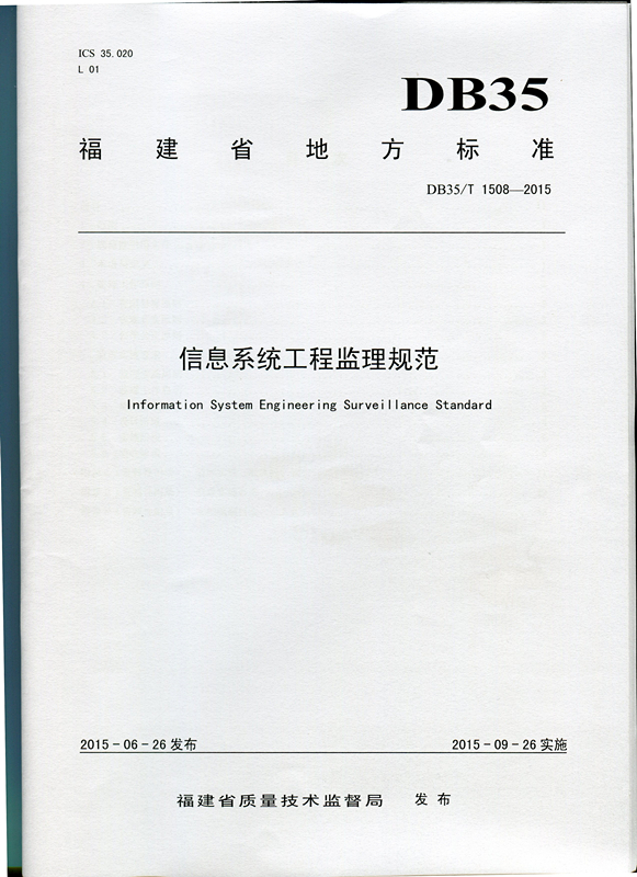 由福建省經(jīng)濟(jì)信息中心、福建省科技信息所(福建省計(jì)算技術(shù)應(yīng)用研究所)聯(lián)合起草的福建省地方標(biāo)準(zhǔn)《信息系統(tǒng)工程監(jiān)理規(guī)范》(DB35/T 1508—2015)經(jīng)福建省質(zhì)量技術(shù)監(jiān)督局批準(zhǔn),于2015年6月26日發(fā)布,并于2015年9月26日實(shí)施。